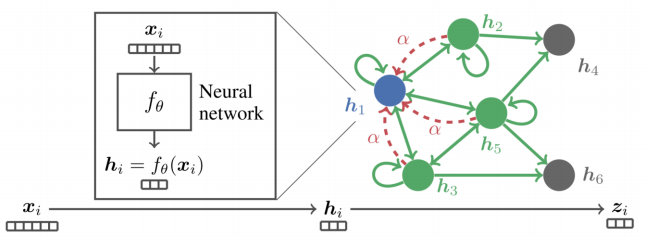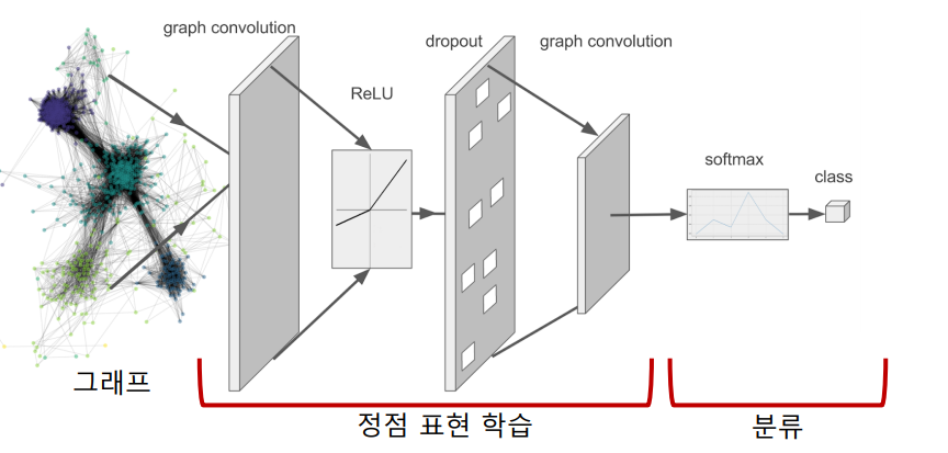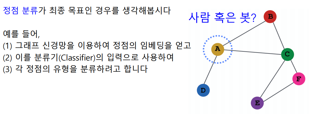 다음 그림은 그래프가 주어졌을 때, 이것을 정점 표현 학습을 하고 분류를 하는 것이다. 중요한 것은 정점 분류(후속 과제)에 손실함수를 써서 분류만 하는 것이 아니라, GNN에 역전파를 하는 것이다.