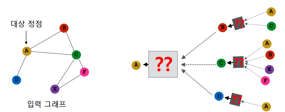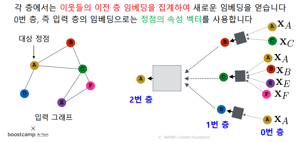 다음 그림과 같이 대상 정점의 임베딩을 얻기 위해 이웃들 그리고 이웃의 이웃들의 정보를 집계한다.