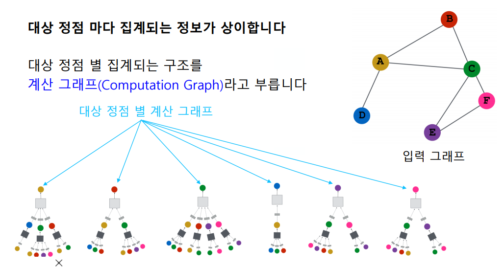 합성곱 신경망에서는 이웃의 수가 균일하지만, 그래프 신경망에서는 그렇지 않다. 그래프 신경망에서는 정점 별로 집계하는 이웃의 수가 다르다.