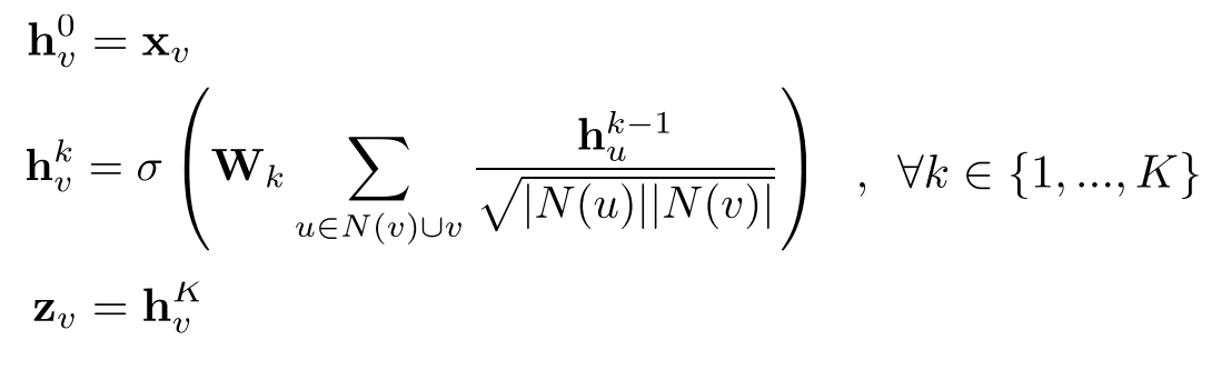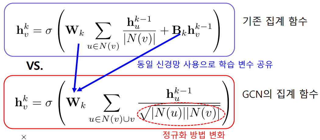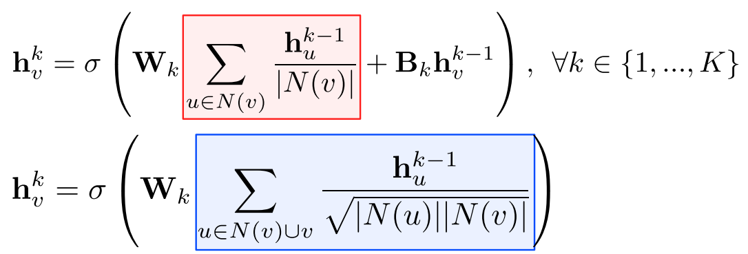 위 그림(GNN)의 집계함수(회색 사각형) 부분을 다르게 사용할 수 있다. GCN의 집계함 수는 다음과 같다.