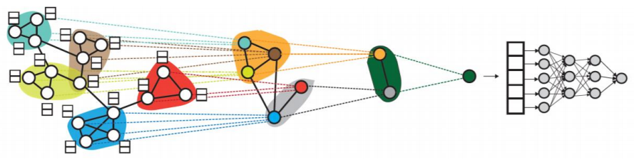 평균 등 단순한 방법보다 그래프의 구조를 고려한 방법을 사용할 경우 그래프 분류 등의 후속 과제에서 더 높은 성능을 얻는 것으로 알려져 있다. 아래 그림의 미분가능한 풀링(Differentiable Pooling, DiffPool)은 군집 구조를 활용 임베딩을 계층적으로 집계한다. 처음에 GNN을 사용하여 임베딩을 얻고, 각 군집별로 임베딩을 합산한다. 합산된 것을 다시 군집화 시켜 합산하고 최종적으로 그래프를 위한 임베딩을 얻어 Classfier를 통과하여 분류한다.