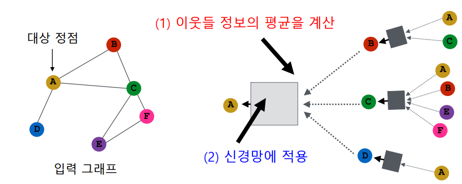이웃 정보들의 평균을 계산한다는 것은 각 이웃들의 정보(입력)의 차원을 동일하게 적용한다는 뜻이다. 적용한 것으로 신경망에 적용한다.