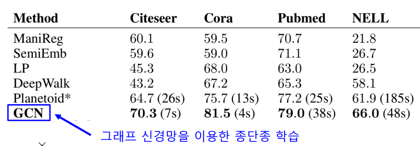 그래프 신경망의 종단종(End-to-End) 학습을 통한 분류는, 변환적 정점 임베딩 이후에 별도의 분류기를 학습하는 것보다 정확도가 대체로 높다. 아래 표는 다양한 데이터에서의 정점 분류의 정확도(Accuracy)이다.