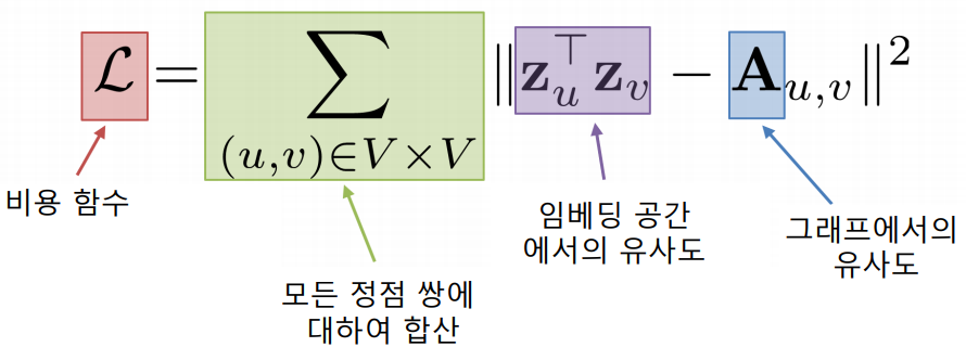 먼저 손실함수를 결정한다. 정점간 거리를 “보존”하는 것을 목표로 할 수 있습니다. 변환식 정점 임베딩에서처럼 그래프에서의 정점간 거리를 “보존”하는 것을 목표로 할 수 있을 것이다. 만약, 인접성을 기반으로 유사도를 정의한다면, 손실 함수는 다음과 같다.