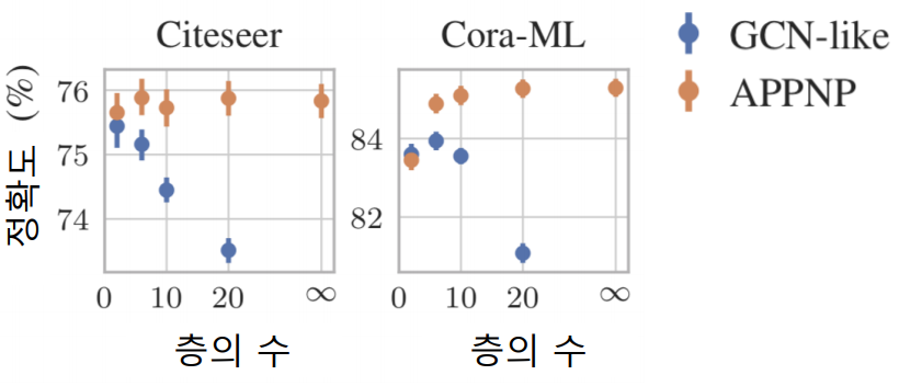 APPNP의 경우, 층의 수 증가에 따른 정확도 감소 효과가 없는 것을 확인했다. 후속 과제로는 정점 분류가 사용되었다.